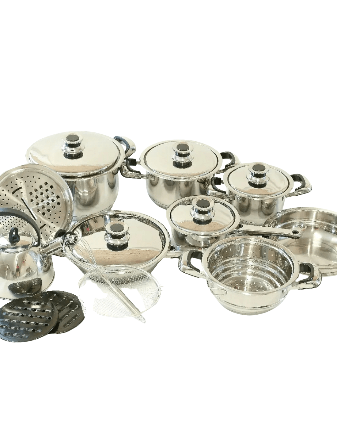 A 28 részes toscana rozsdamentes edény készlet azoknak készült, akik nem szeretnének kompromisszumot kötni a minőség, a tartósság és az elegáns megjelenés között. Ez a komplett edénycsalád minden főzési helyzetre megoldást kínál – a gyors hétköznapi ételektől egészen a nagyobb családi főzésekig.