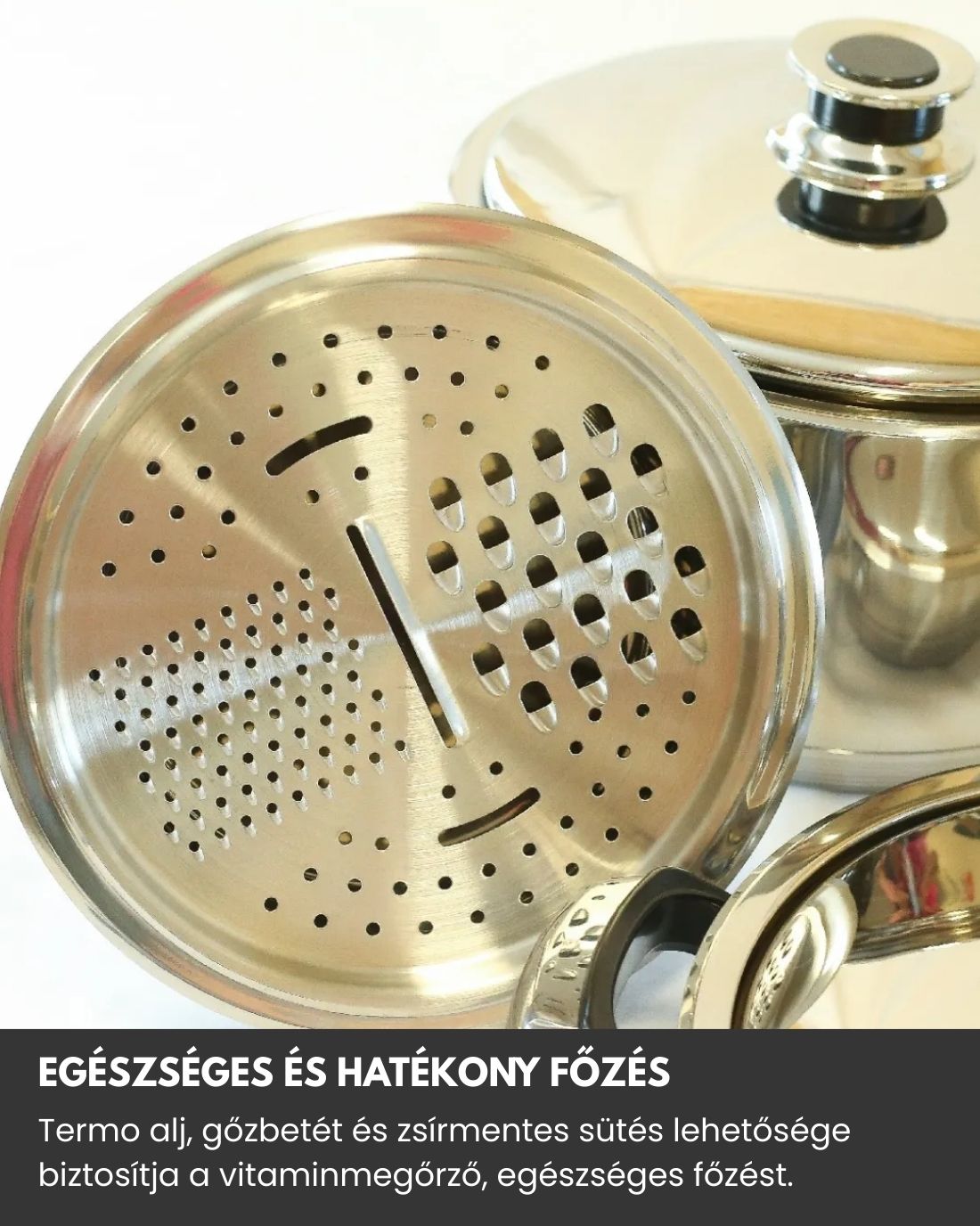 A prémium rozsdamentes acélból készült edények nemcsak időtállók és strapabírók, hanem modern, letisztult megjelenésükkel a konyha díszei is. A gondosan kialakított forma és a masszív felépítés egyenletes hőeloszlást biztosít, így az ételek nem égnek le, és tökéletesen átfőnek.