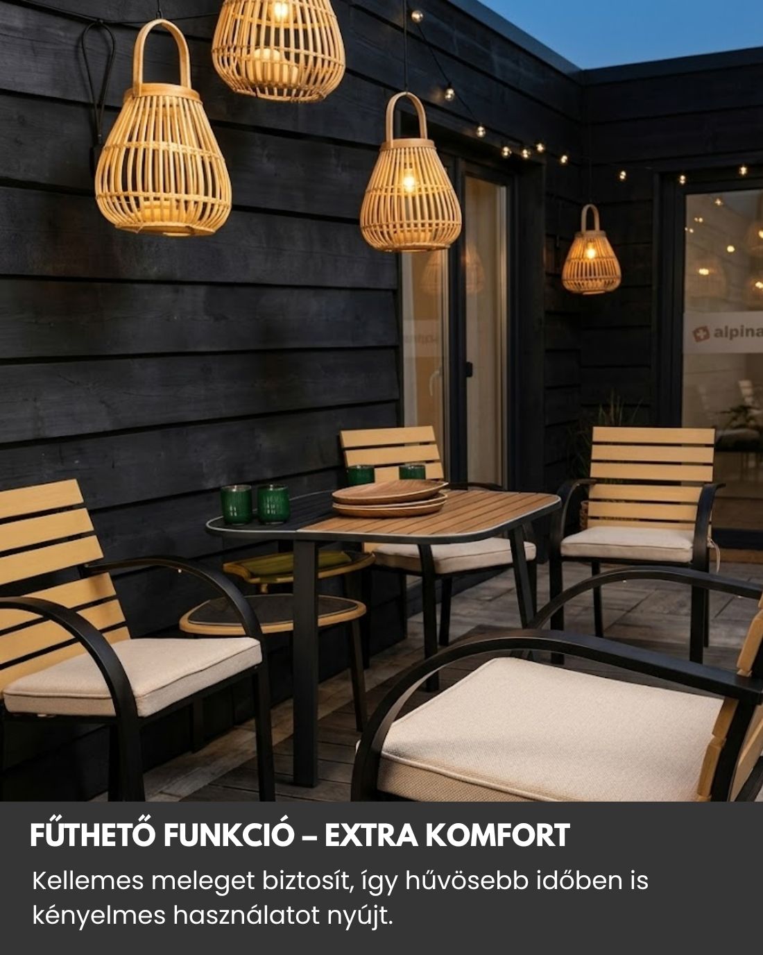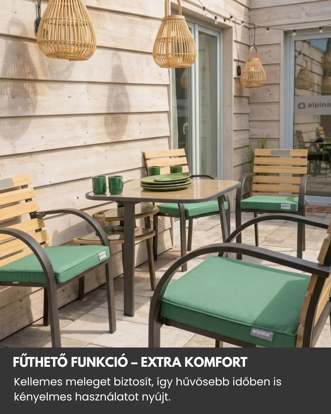 Az Alpina fűthető kerti párna ideális választás, ha hűvösebb időben is szeretnéd kényelmesen élvezni a kertet, teraszt vagy erkélyt. A beépített fűtési funkció kellemes meleget biztosít, így a kültéri pihenés még komfortosabbá válik.
