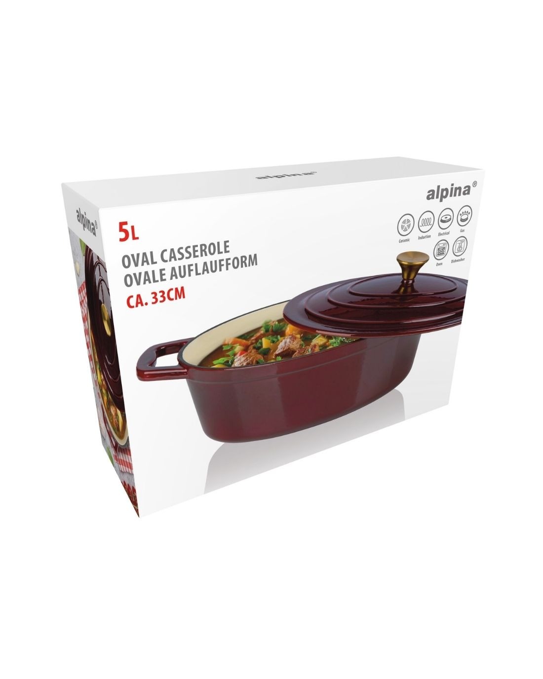 Az Alpina öntöttvas lábas 33 cm bordó kivitelben kiváló hőtartással és nagy kapacitással ideális családi főzésekhez. Masszív kialakítása és egyenletes hőelosztása tökéletes eredményt biztosít.