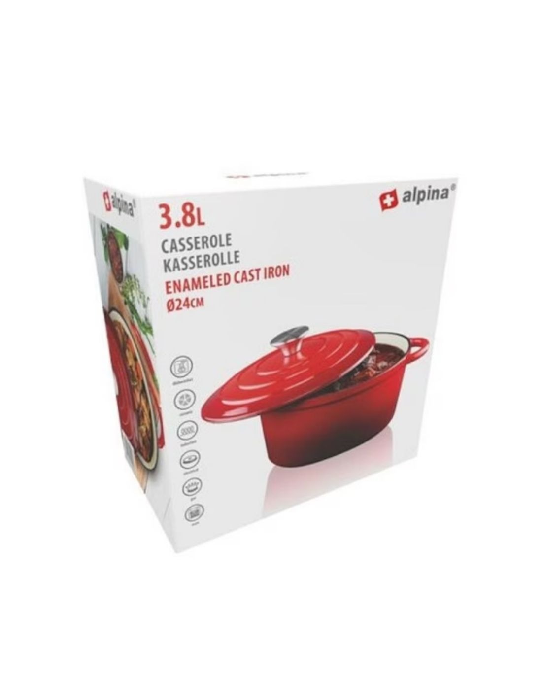 Az Alpina zománcozott öntöttvas lábas (casserole edény) 3,8 literes kapacitással, piros színben ideális választás, ha egy tartós, megbízható és esztétikus főzőedényt keresel. Az öntöttvas anyag és a zománcozott bevonat kombinációja garantálja az egyenletes hőelosztást és a kiváló főzési élményt.