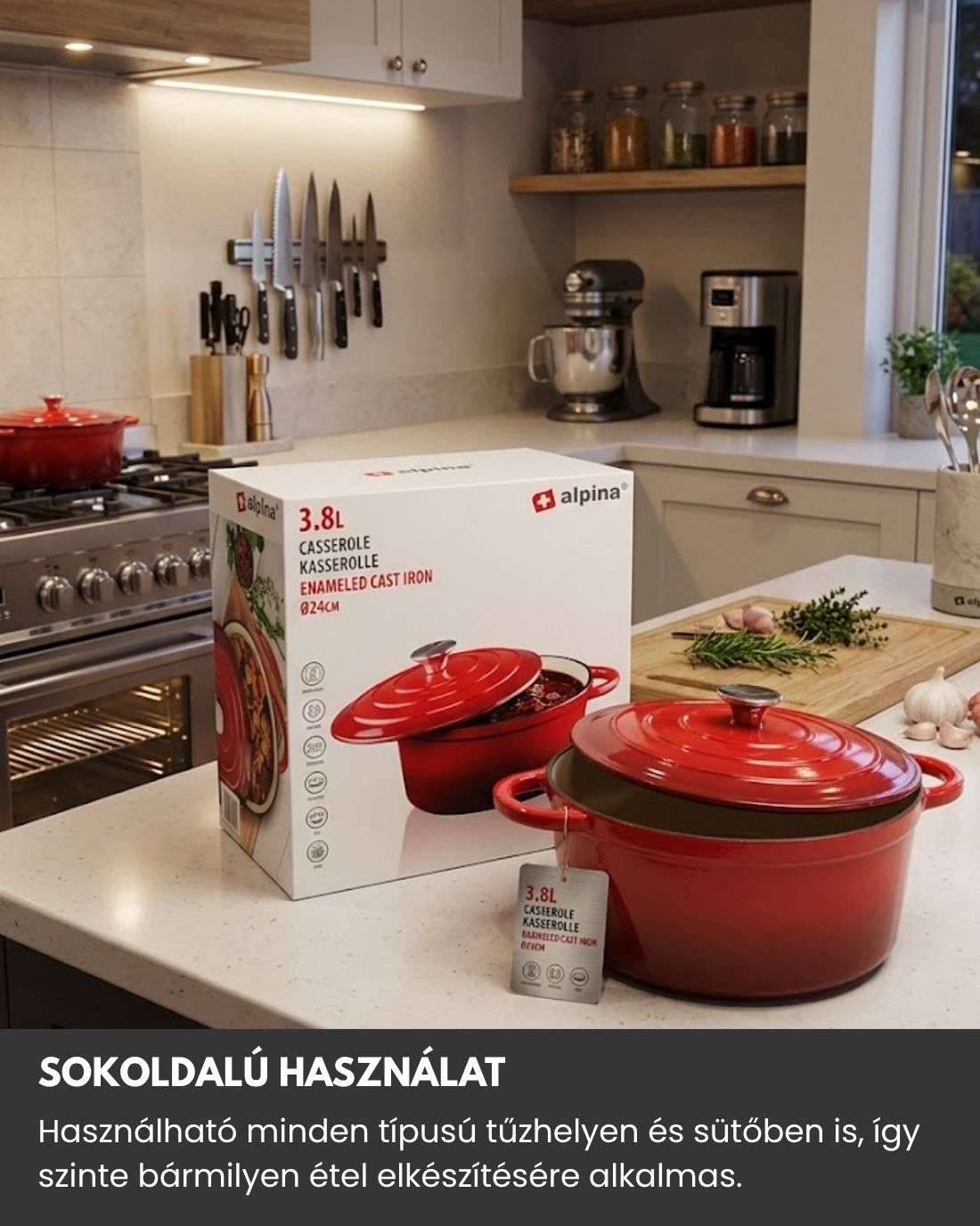 Az Alpina öntöttvas lábas 3,8L piros kivitelben tökéletes választás, ha tartós, sokoldalú és stílusos főzőedényt keresel a mindennapi főzéshez.