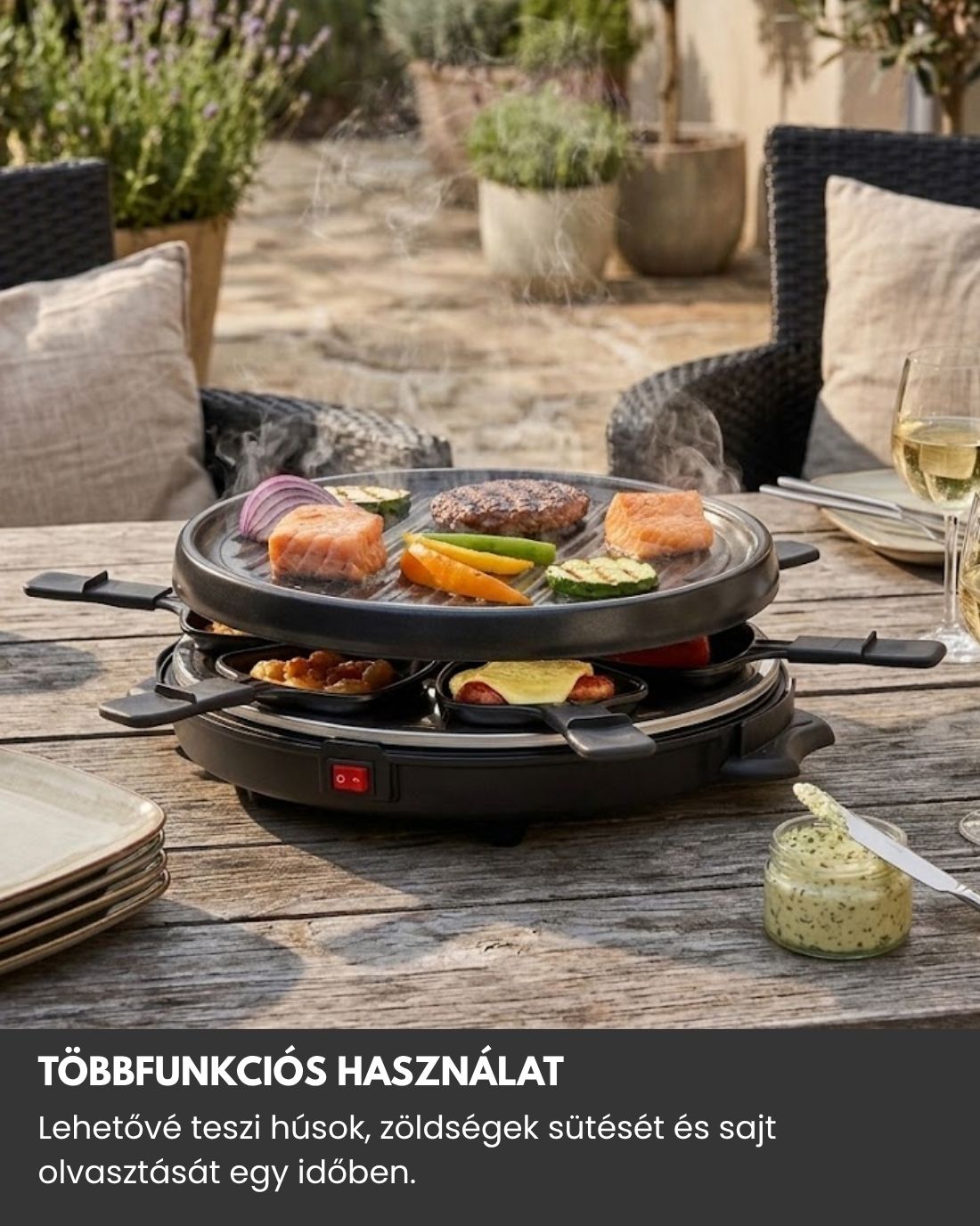 Az Alpina raclette grillsütő tökéletes választás, ha különleges és élménydús étkezéseket szeretnél otthon. Az asztali grill lehetővé teszi, hogy mindenki saját ízlése szerint készítse el az ételeit, így ideális családi vacsorákhoz, baráti összejövetelekhez vagy akár ünnepi alkalmakhoz is.