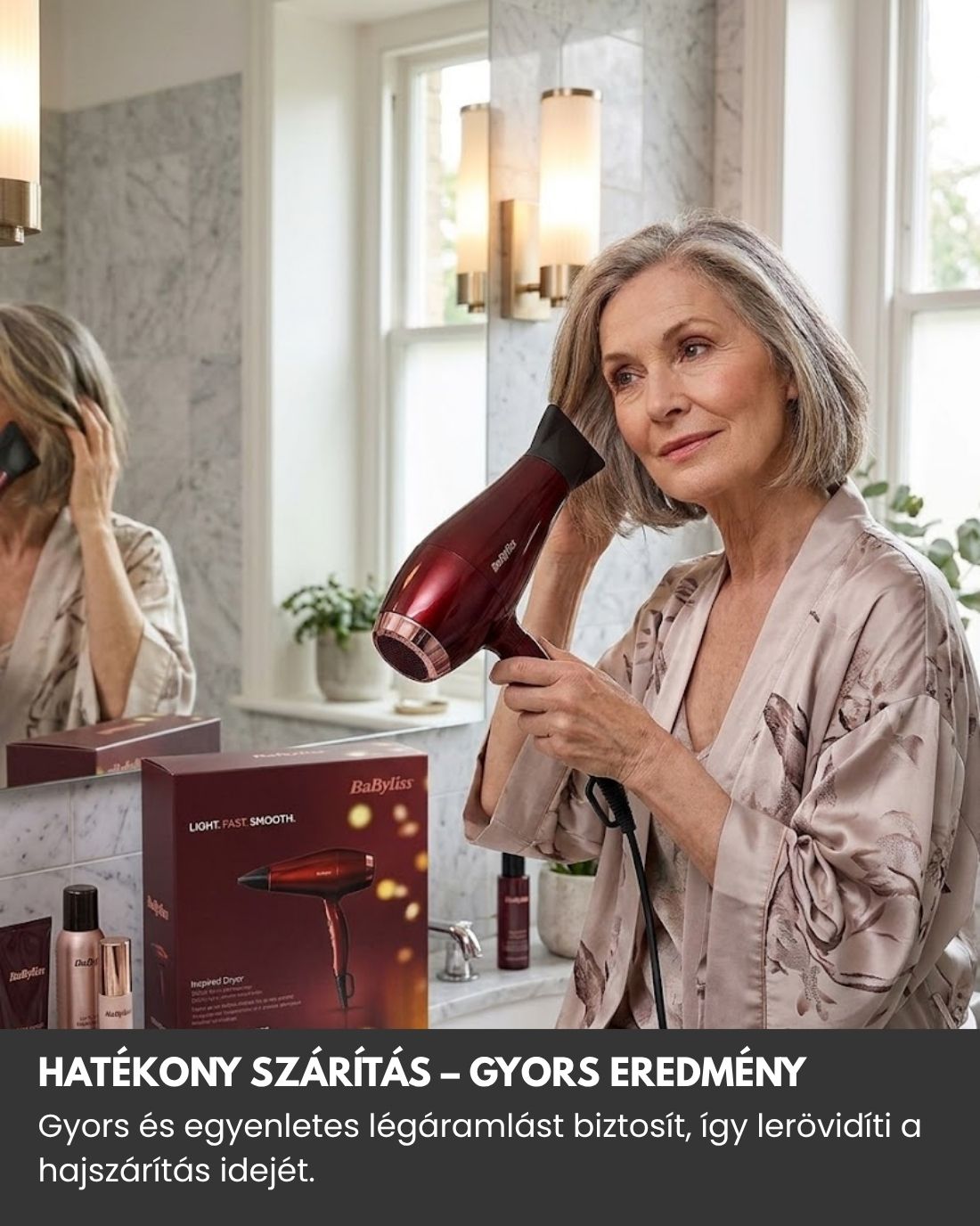Modern és letisztult megjelenésével a hajszárító nemcsak funkcionális, hanem esztétikus kiegészítője is lehet a fürdőszobának.