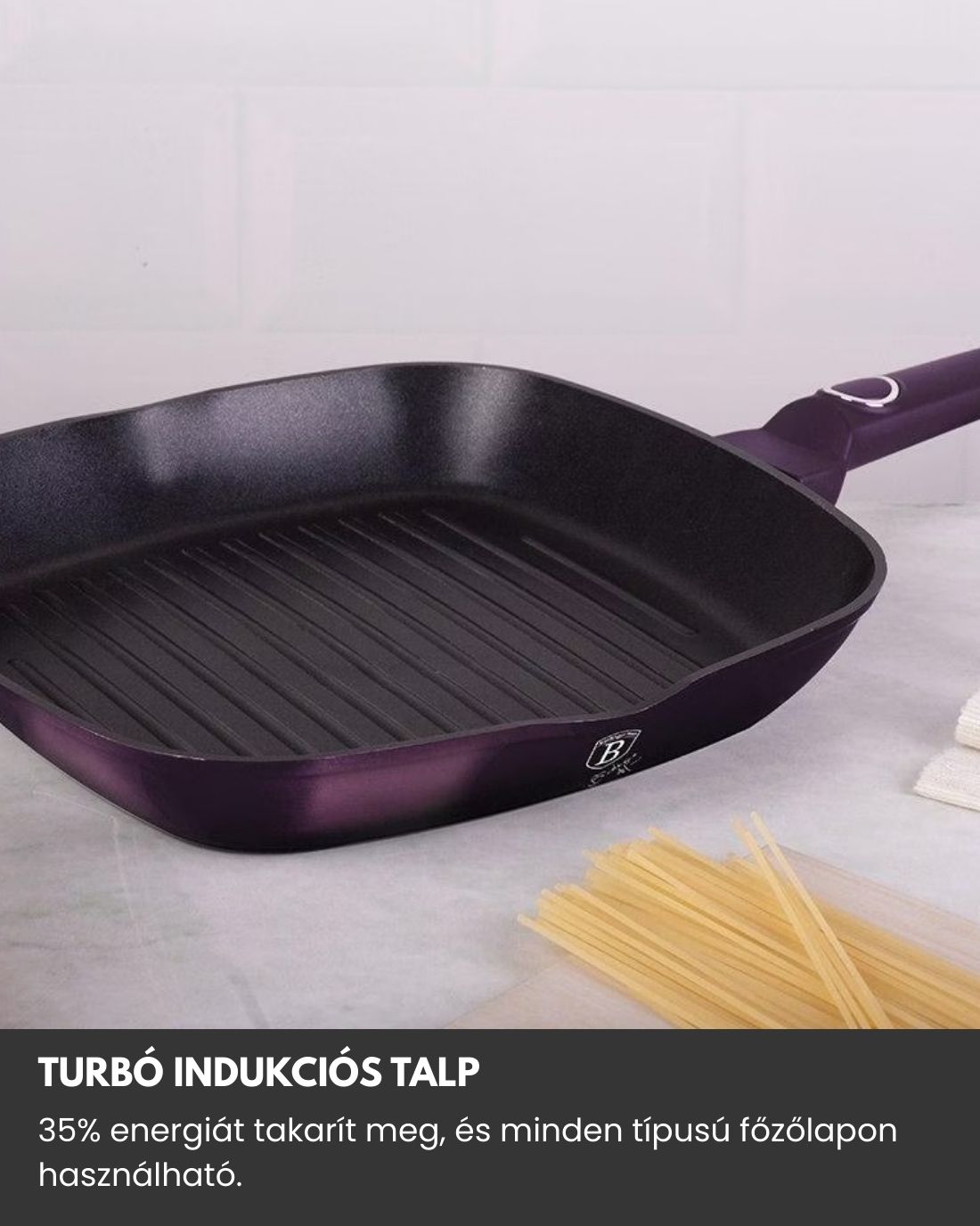 A tapadásmentes grill serpenyő turbó indukciós talppal rendelkezik, amely egyenletes hőeloszlást biztosít minden típusú főzőlapon – legyen az gáz, elektromos vagy indukciós. Az energiahatékony kialakításnak köszönhetően akár 35%-kal kevesebb energiát használ, így gazdaságos és környezetbarát választás.
