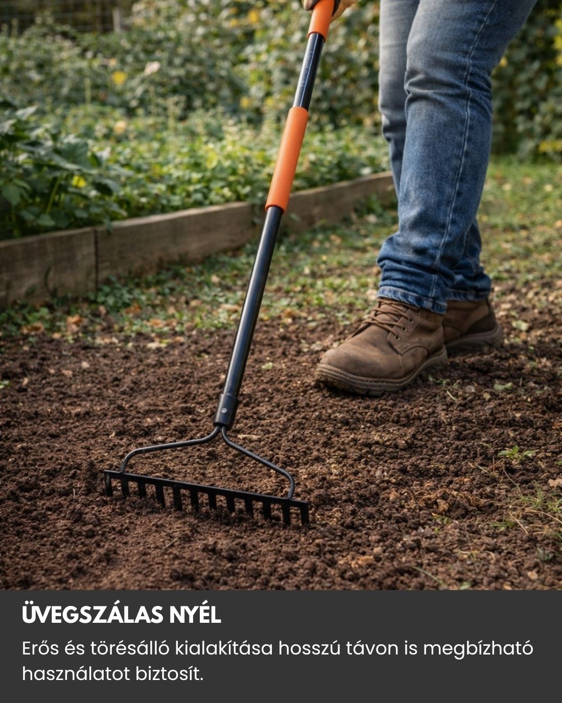 A gereblye kialakítása intenzív használatra is alkalmas, miközben megbízható teljesítményt nyújt.