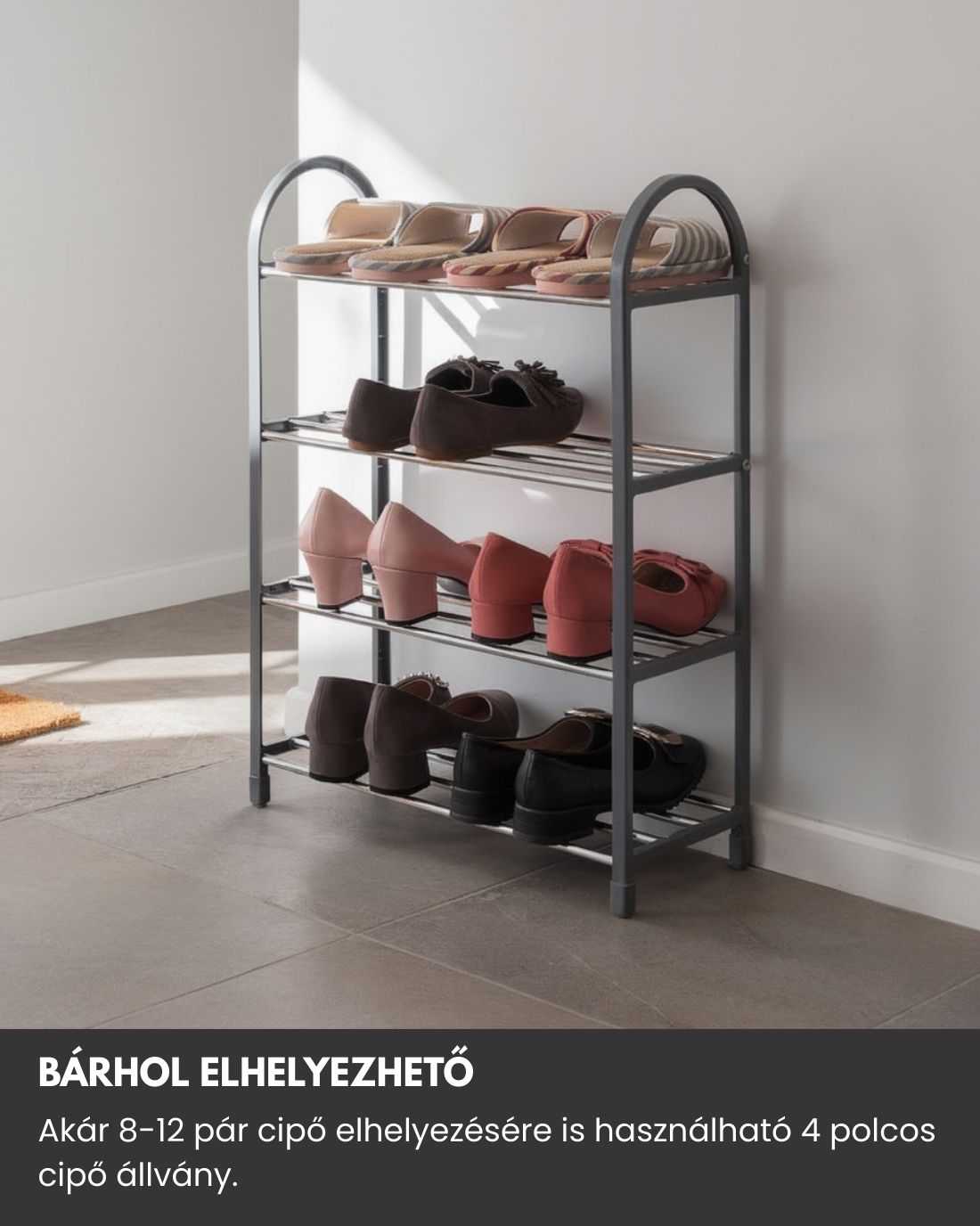 A 4 polcos kialakítás lehetővé teszi akár 8–12 pár cipő tárolását (a cipők méretétől függően). Ideális sportcipők, utcai cipők, papucsok vagy akár gyerekcipők rendszerezésére is. Segít megszüntetni a rendetlenséget, és minden cipő könnyen elérhető marad.