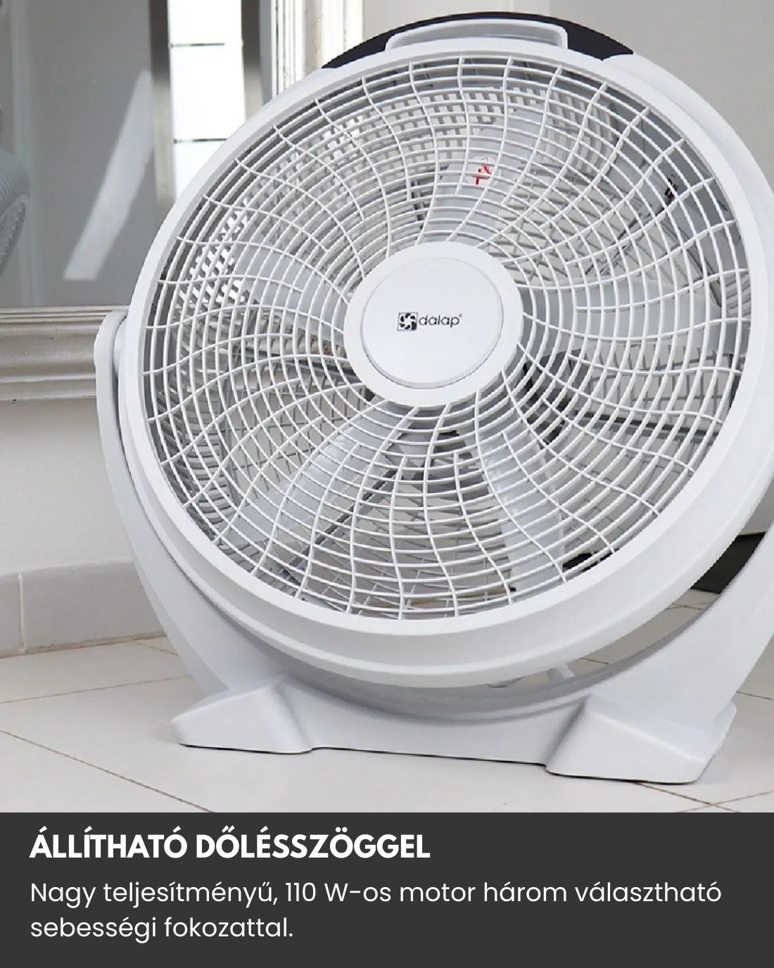 A fehér színű, 50 cm átmérőjű Dalap SILVIA padló ventilátor kellemes, hűvös levegőt biztosít a forró nyári napokon. A könnyen kezelhető, állítható dőlésszöggel bíró ventilátor 110 W teljesítményű motorja három választható sebességgel rendelkezik.
