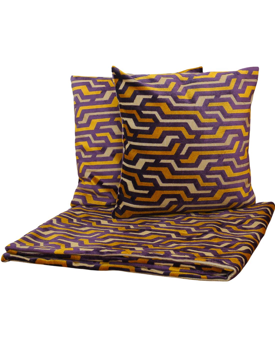 Lila- mustársárga geometrikus díszpárna szett ágydísszel – Modern, karakteres stílus