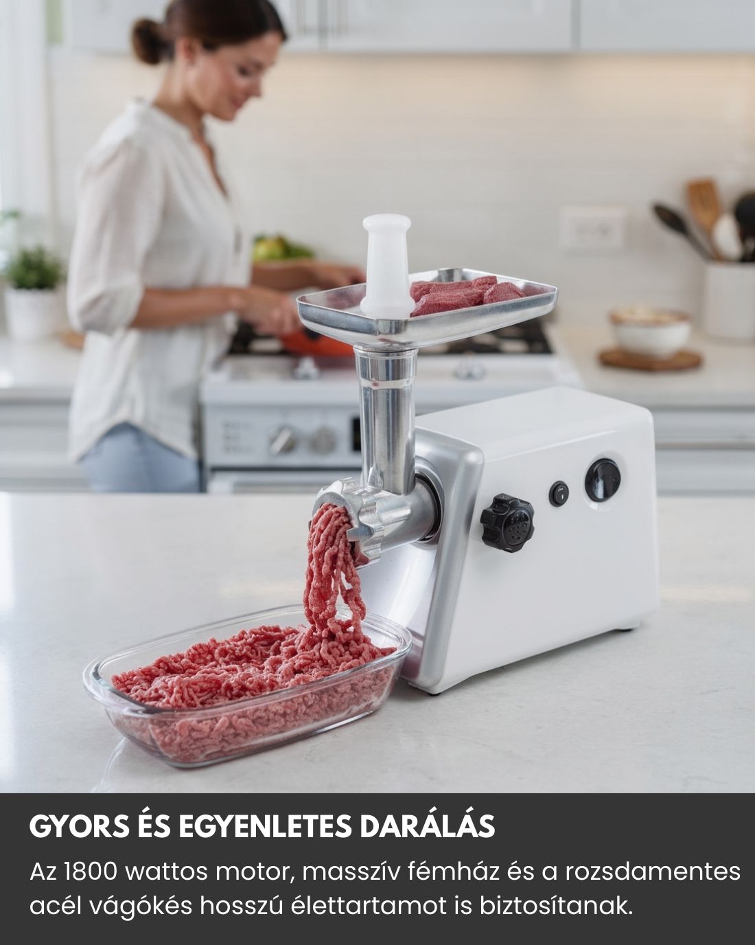 - Erős, 1800 W-os motor, gyors és hatékony darálás friss húsból, egyenletes eredménnyel.