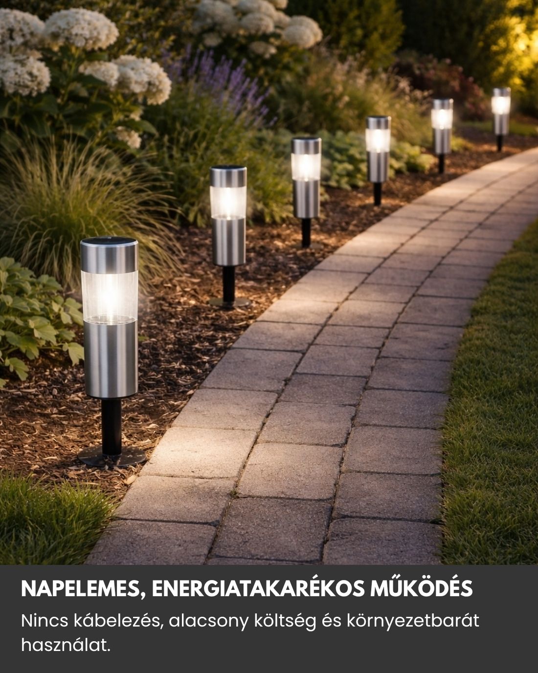 A letisztult designnak köszönhetően a lámpák nemcsak világítanak, hanem díszítik is a kertet, hangulatos megvilágítást biztosítva.