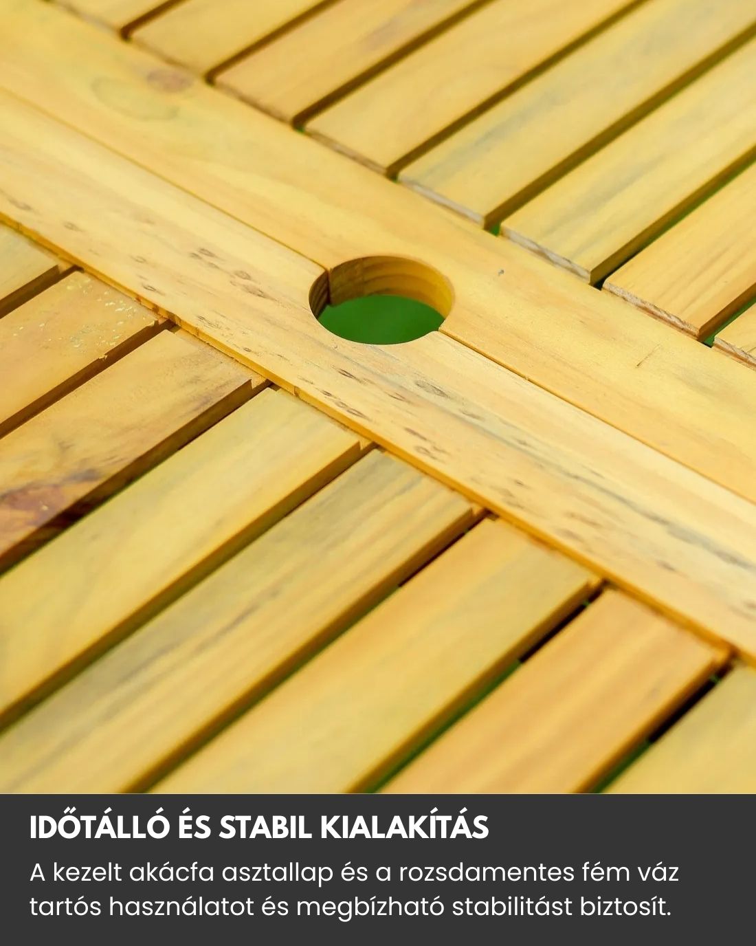 - Asztallap anyaga: tartós, kezelt akácfa – hosszú élettartam, természetes szépség