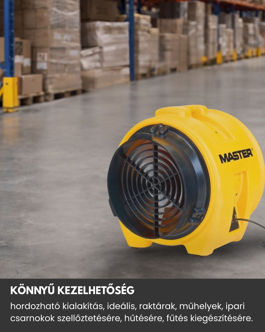 A Master BL 8800 ventilátor fém háza rendkívül stabil és tartós, így ipari környezetben is megbízhatóan üzemel. A motor hővédelemmel rendelkezik, ami megakadályozza a túlmelegedést, így hosszú távon biztonságos működést biztosít. A készülék hordozható, könnyen mozgatható, így bármikor gyorsan átállítható a kívánt munkaterületre.
