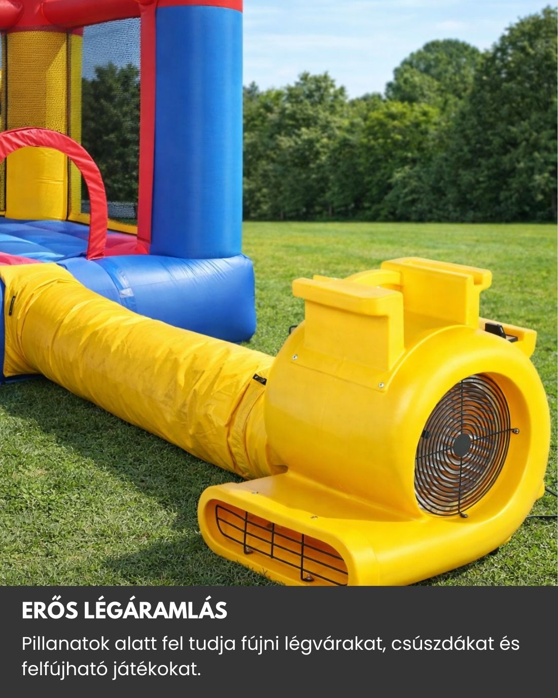 A ventilátor radiális kialakítása biztosítja, hogy a levegő nagy távolságra is célzottan jusson el, miközben a légnyomás hosszú időn keresztül fenntartható. Ez különösen előnyös felfújható játékok, légvárak, csúszdák vagy kültéri eszközök gyors és biztonságos felállításánál.