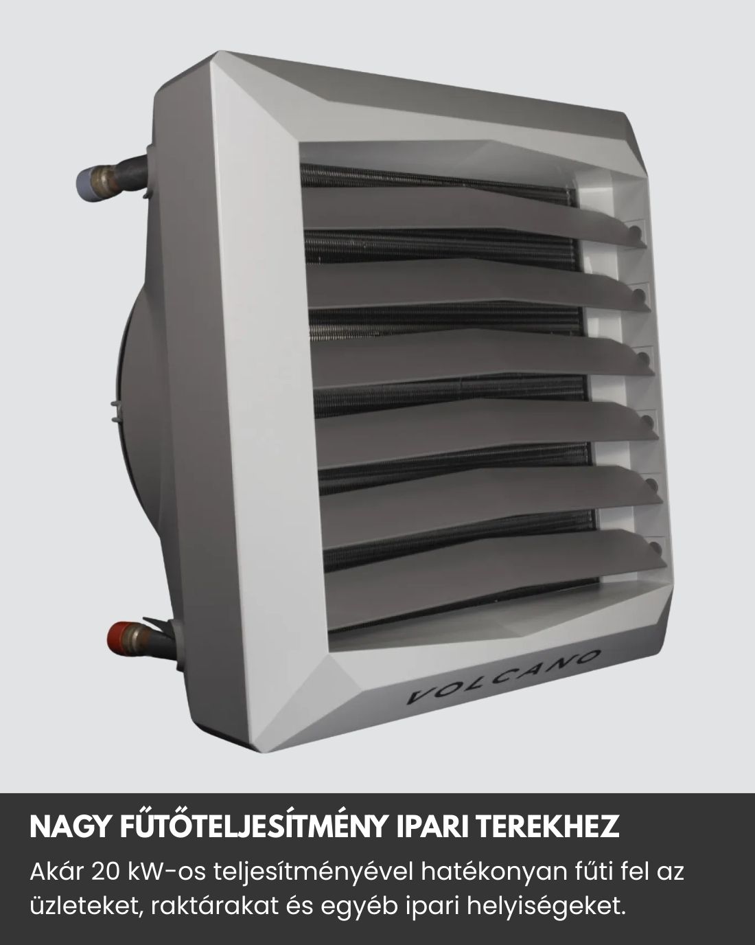 A Volcano VR MINI hőlégfúvó egység egy kompakt készülék EC motorral és nagy, akár 20 kW-os fűtőteljesítménnyel. Megfelelően kifűti a különböző ipari helyiségeket. Az egység működése melegvíz, vagy más forró folyadék melegítésétől függ – szükségszerű az egység csatlakoztatása melegvíz-hálózathoz vagy elektromos bojlerhez. A forró folyadék áramlik az egység csővezetékein, a nagy teljesítményű 2100 m3/óra légáramlású ventilátor szétfújja a forró levegőt és felmelegíti a helyiséget.